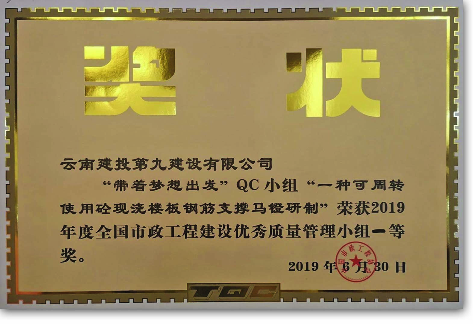 全國市政工程建設(shè)優(yōu)秀質(zhì)量管理小組一等獎